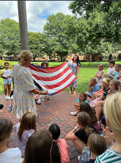 The girls will have many opportunities to lead this year. Raising the flag each morning is just one of those special responsibilities. On Wednesday, the entire Fourth Grade gathered to learn how to raise and lower the flag. The trickiest part is folding the flag, and our Fourthies are already doing a great job. In fact, some of the girls were practicing their flag fold with their picnic blankets and towels. Great job, girls! Here is a tiny peek into this responsibility.